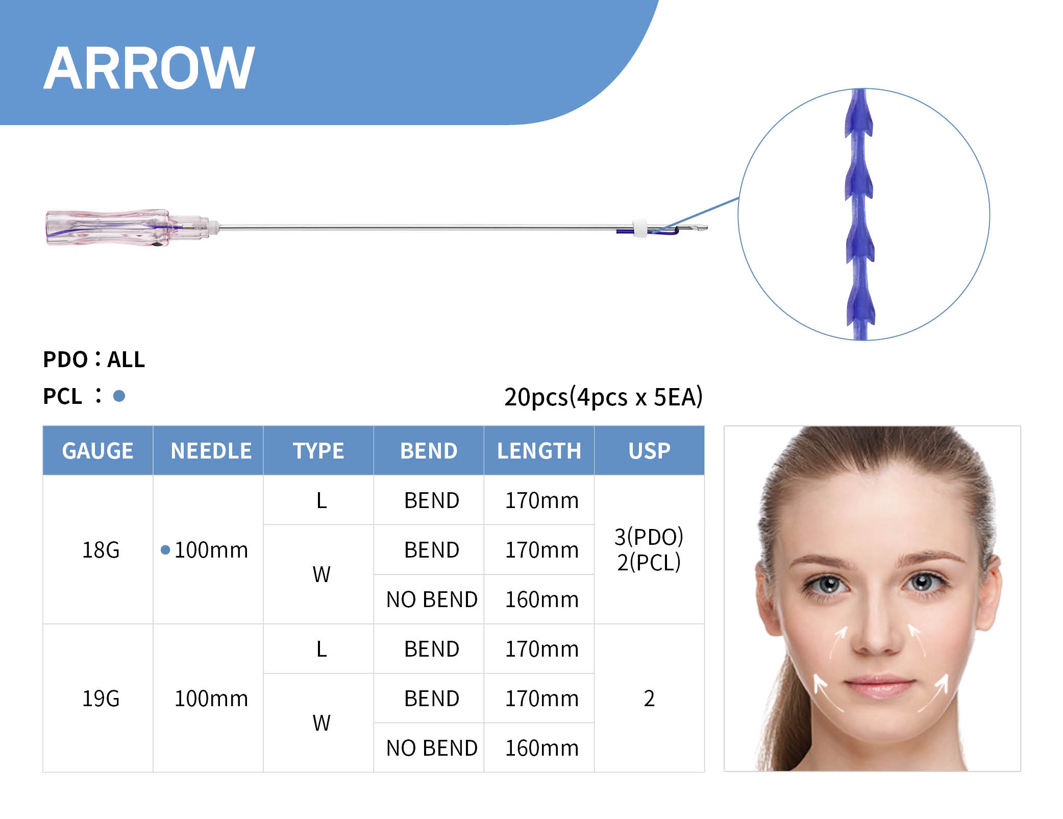 نخ ARROW یک مدل دیگر از نخ های خاردار مولدینگ می باشد که اثر لیفتینگ قدرتمند، فوری و پایداری دارند. نوع شکل خار شبیه به تیغه ی استخوان ماهی است و به فیش بن معروف است. نوع خار قدرت فیکس شدن نخ را به حداکثر می رساند که با USP2 و USP3 با ضخامت و مقاومت بسیار بالا برای لیفتینگ و کانتورینگ نواحی مختلف صورت و بدن استفاده می شود. در واقع، این مدل خار به بافت پوست قلاب شده و پوست را به سمت بالا لیفت میکند.
