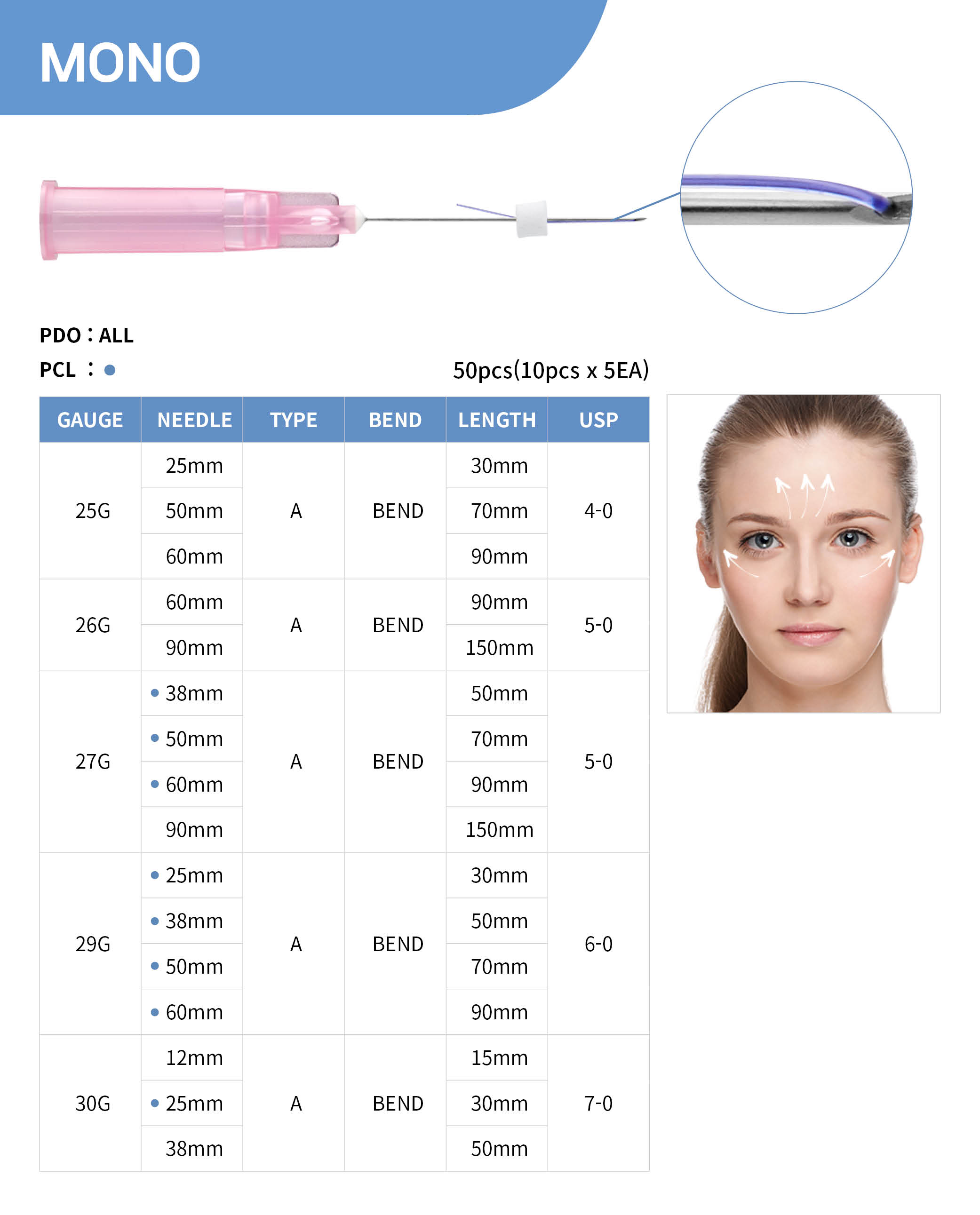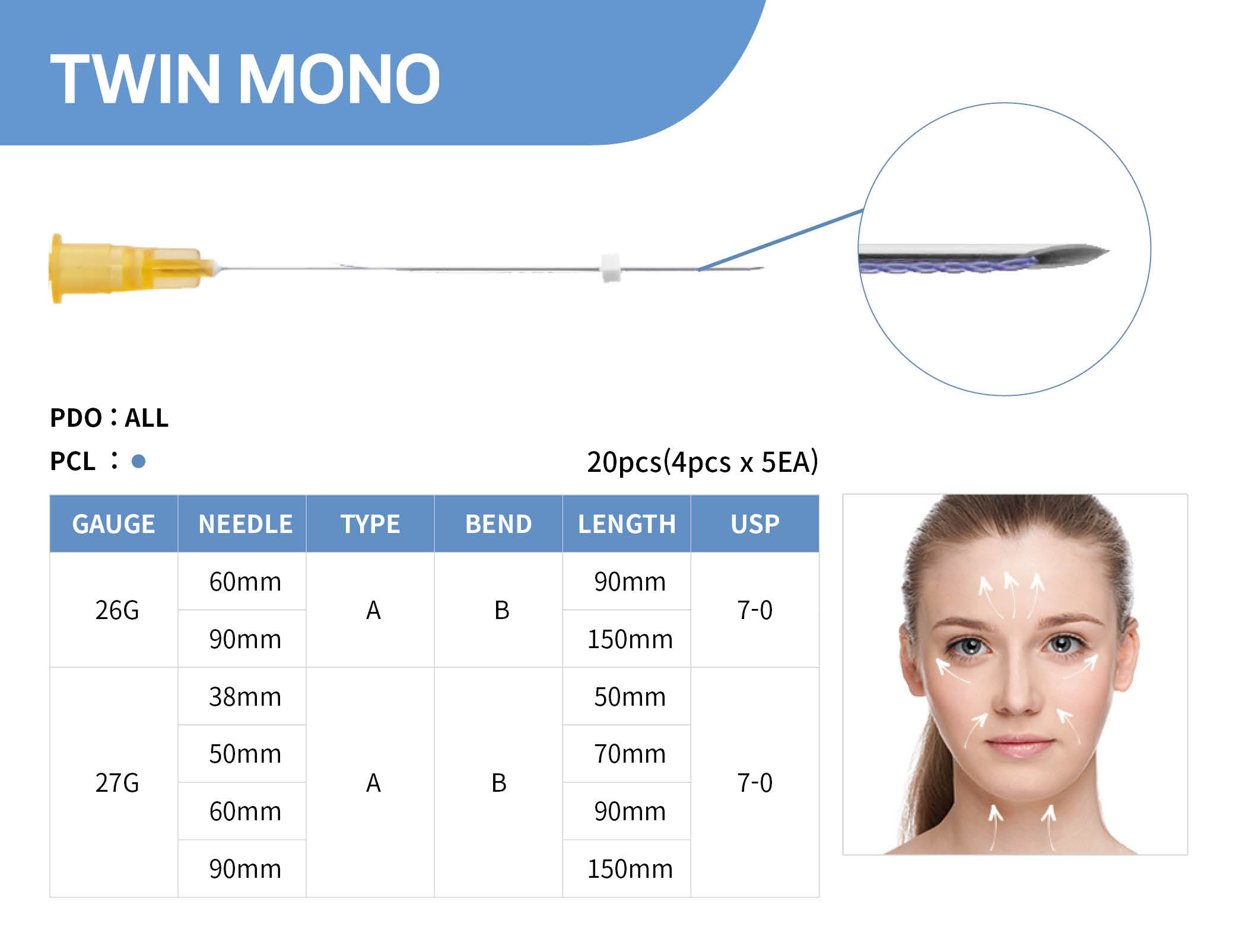 نخ های MONO ، نخ های صاف و بدون خار هستند. برای ایجاد اثر سفت کنندگی پوست ، تعداد زیادی از این نخ ها با آرایش تور مانند در زیر پوست قرار میگیرند و با روند کلاژن سازی ، قوام و سفتی پوست را بهبود می دهند. از نخ های مونو ، میتوان برای خطوط پنجه کلاغی اطرف چشم ، حالت سنگ فرشی اطراف چانه ، خطوط گردن ( افتادگی پوست گردن و پیشانی ) و زیر چشم استفاده کرد. برای ایجاد اثر لیفت بیشتر ، بهتر است با نخ های کاگ ترکیب شوند. نخ های TWIN MONO همان نخ مونو می باشد ، با این تفاوت که دو عدد نخ در یک نیدل ایتفاده شده است.