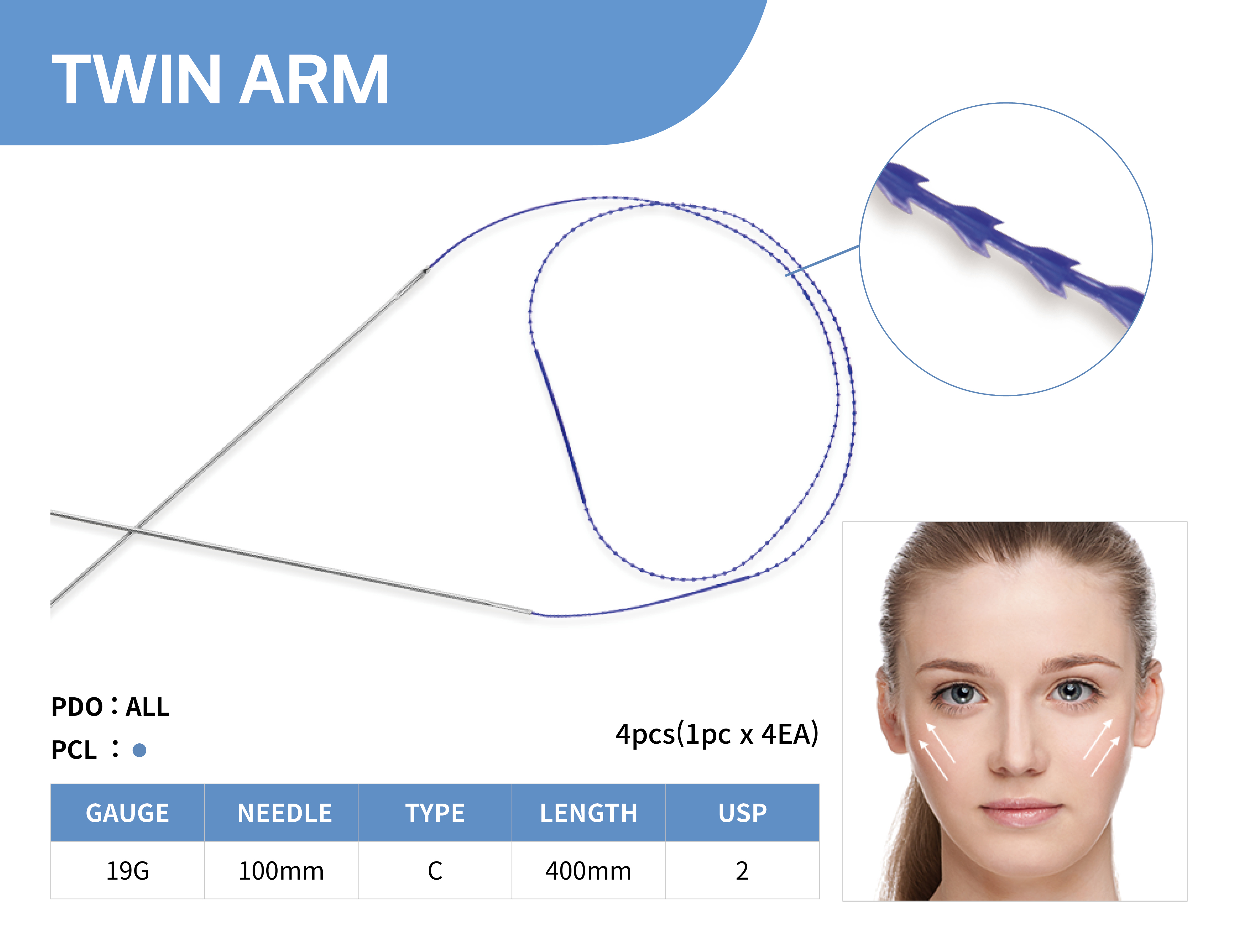 TEIN ARM نوع دیگر از نخ های مولدینگ می باشد. نخ دوسوزنه عمدتا برای پشتیبانی قسمت های بالای هر ابرو و کل صورت استفاده می شود. یکی از مزایای این محصول این است که یک جراحی بزرگ که تنها ازطریق برش امکان پذیر بوده را با فناوری پیشرفته به یک روش ساده تبدیل می کند. همچنین این محصول با خاصیت و مقاومت عالی برای لیفت سینه ، ساعد ، سه سر بازو و باسن قابل استفاده است.