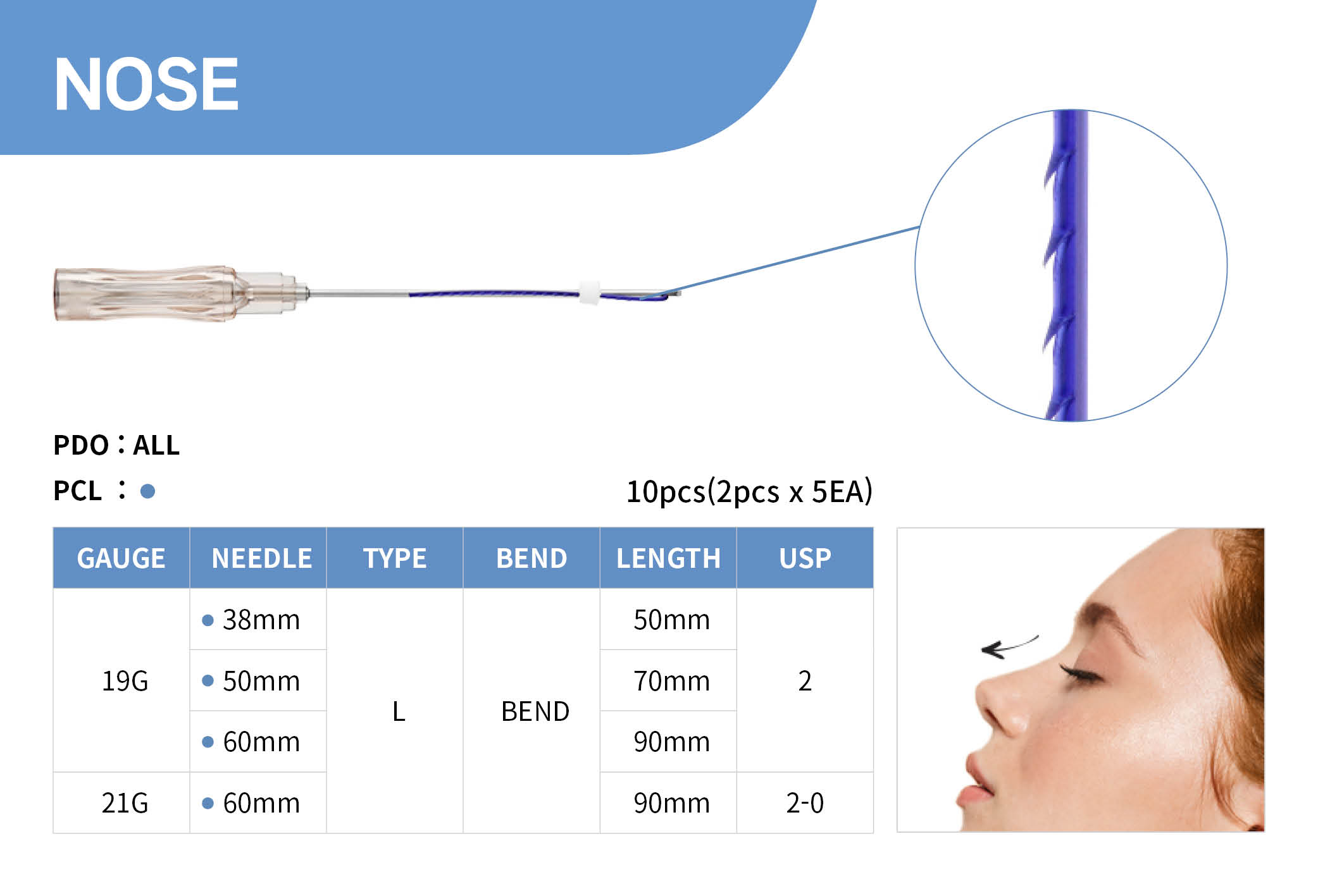 نخ NOSE بهترین نخ لیفت بینی است زیرا در حداقل زمان ممکن قابل اجرا بوده و درد کمتری به همراه دارد. این نخ برای بالا بردن نوک بینی و فرم دهی بینی مورد استفاده قرار می گیرد. نخ های این کمپانی بسیار امن هستند و کامل در بینی جای می گیرند و نیاز به کات شدن ندارند.