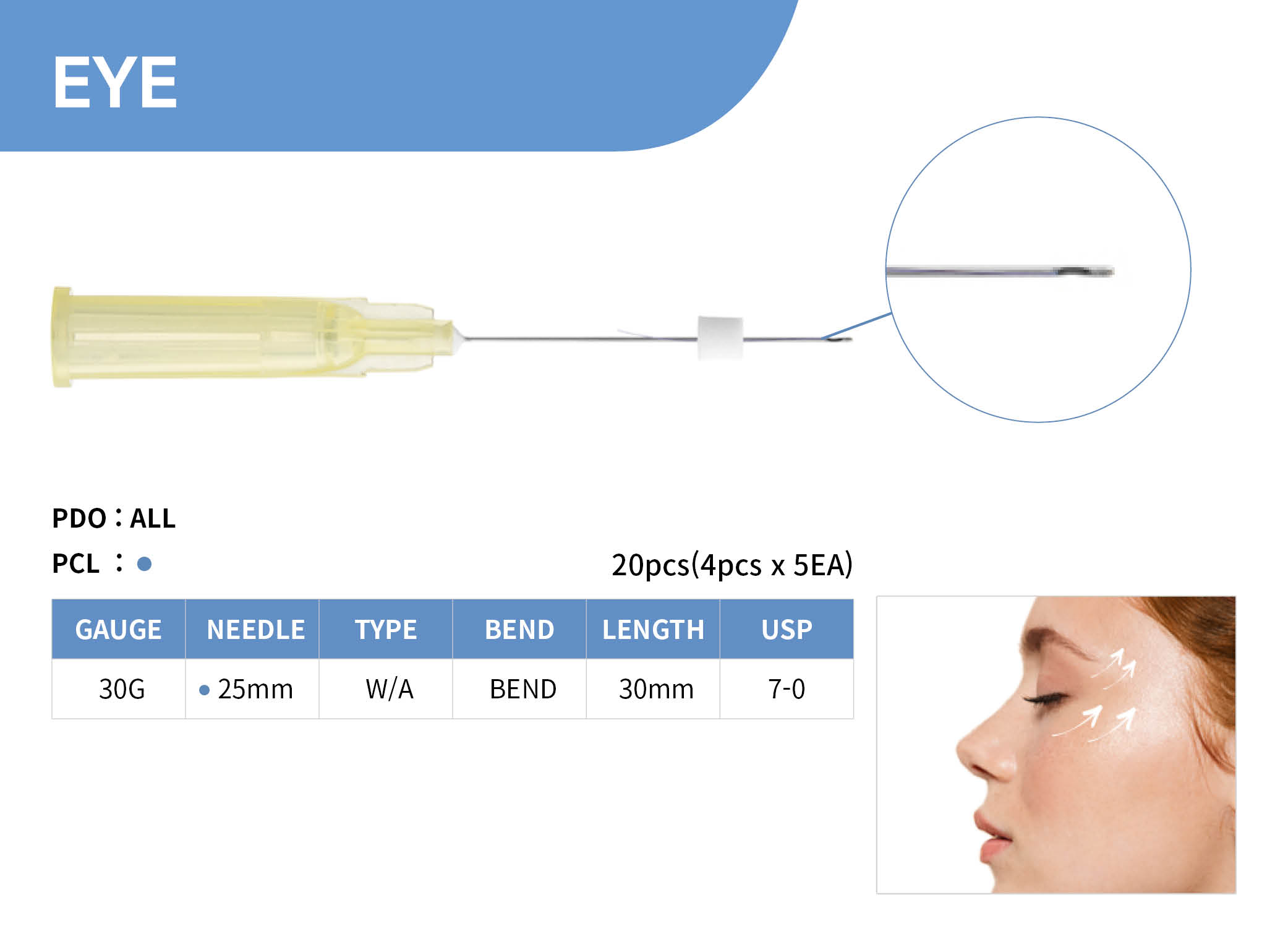نخ های EYE ، برای اطراف چشم استفاده میشوند که اثر کلاژن سازی و جوانسازی بسیار قوی داشته و به رفع سیاهی و تیرگی اطراف چشم کمک می کنند و همچنین با ایجاد کلاژن ، باعث بر طرف شدن چین و چروک می شوند. این نخ دارای دو مدل PDO و PCL می باشد ، و سوزن آن بلانت است و از نوع W بوده که به هیچ عنوان به عروق اطراف چشم صدمه نمی زند و درد ، تورم و کبودی را به حداقل می رساند.